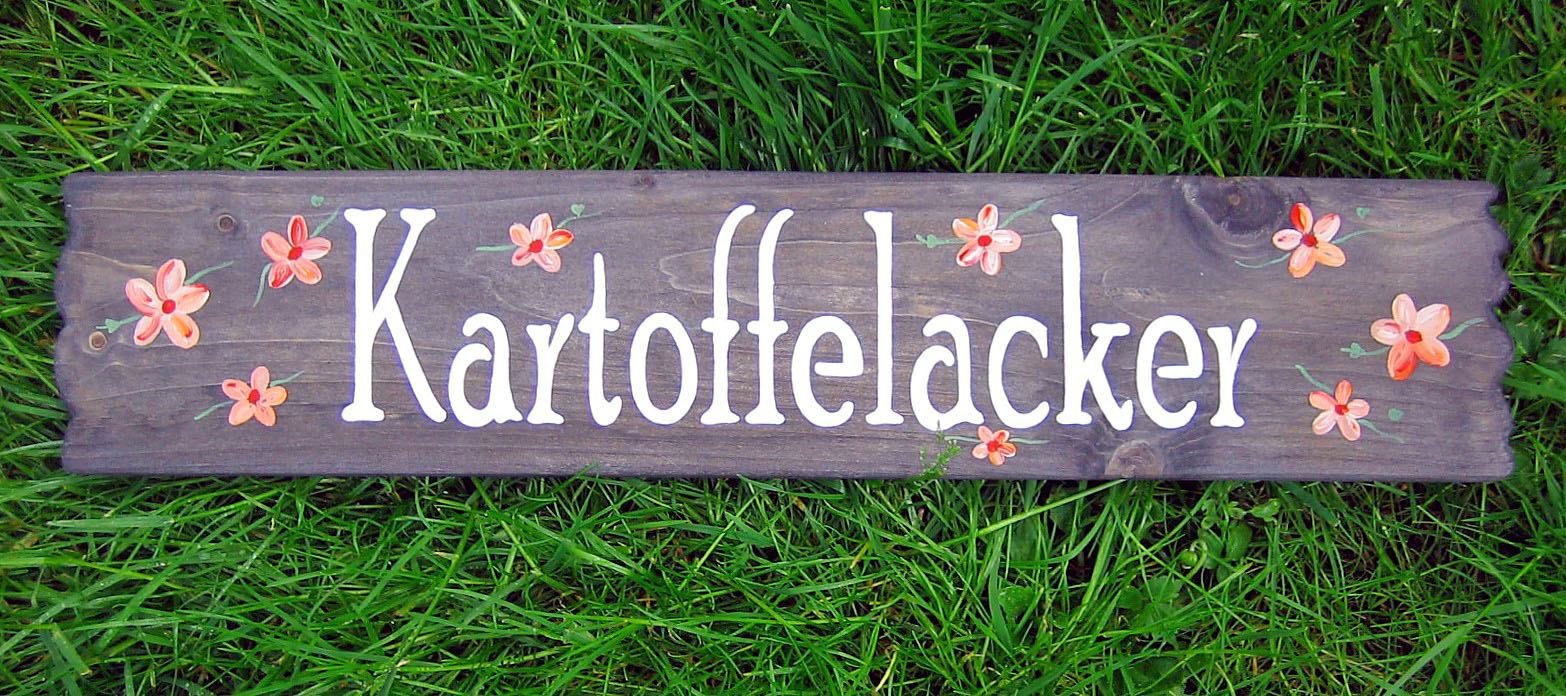 Auf der in märchenhaften in Ebenholz lasierten Grundierung, wird die Beschriftung des von Ihnen gewünschten Gartenbereichs in leuchtendem weiß aufgetragen.