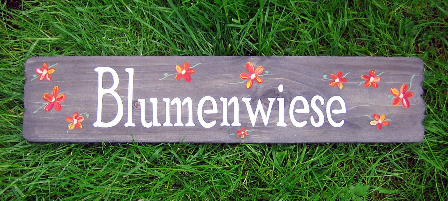 Ein großes rustikales Gartenschild, bestechend durch eine Vielfalt an bunten Blüten, die eine große wirkungsvolle Beschriftung farblich passend unterstreichen.