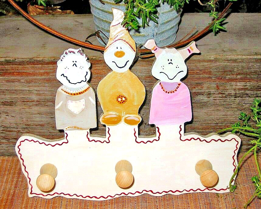 Eine fröhliche Kindergarderobe aus Holz, über deren 3 Massivholzhaken 3 bunte kleine Wichtel herunterschauen.