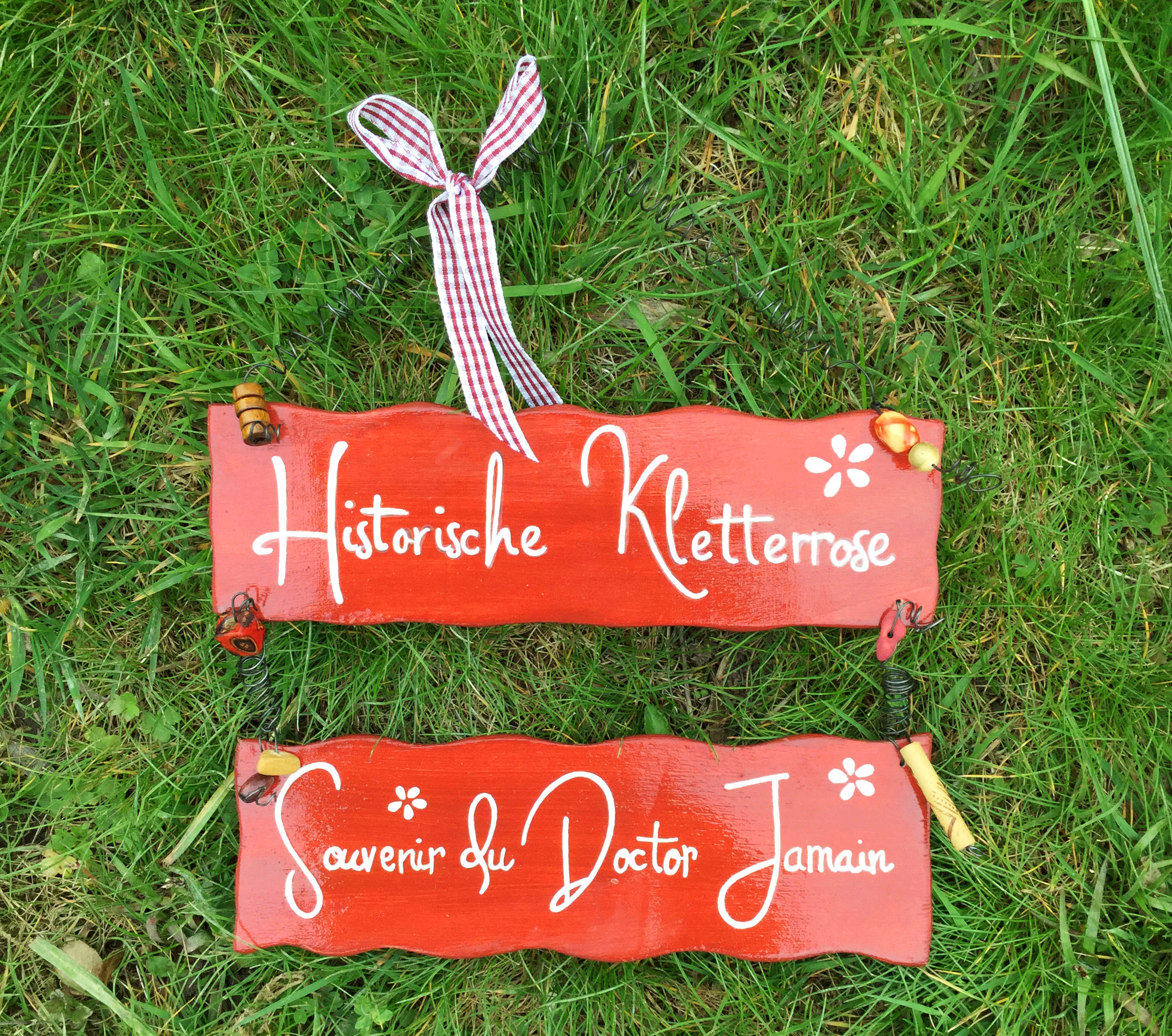 Verbunden mit perlenverzierten feinen Drahtlöckchen sowie der gewellten Aufhängung präsentiert das Rosenschild stolz, wer hier wächst.