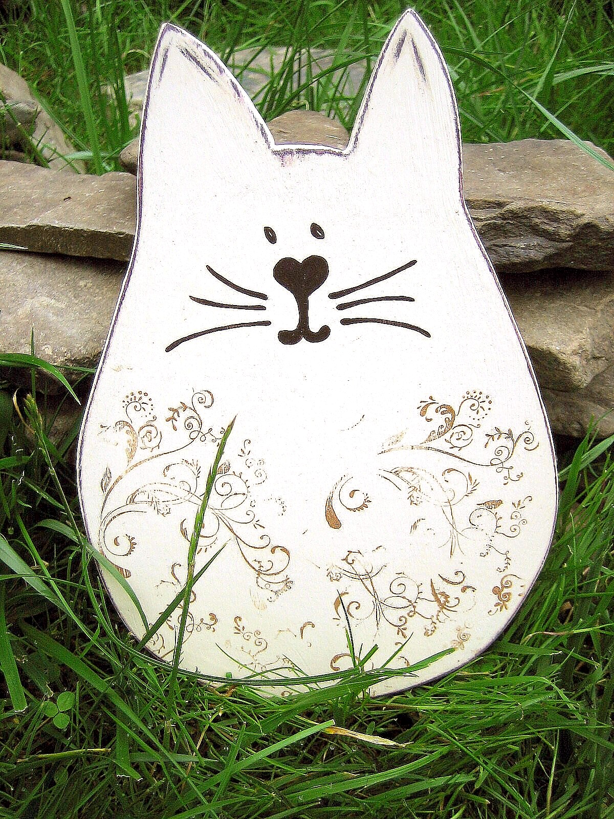 Durch eine mehrfache Versiegelung kann die Katze feucht abgewischt werden. (Der Holzkeil bleibt naturbelassen)