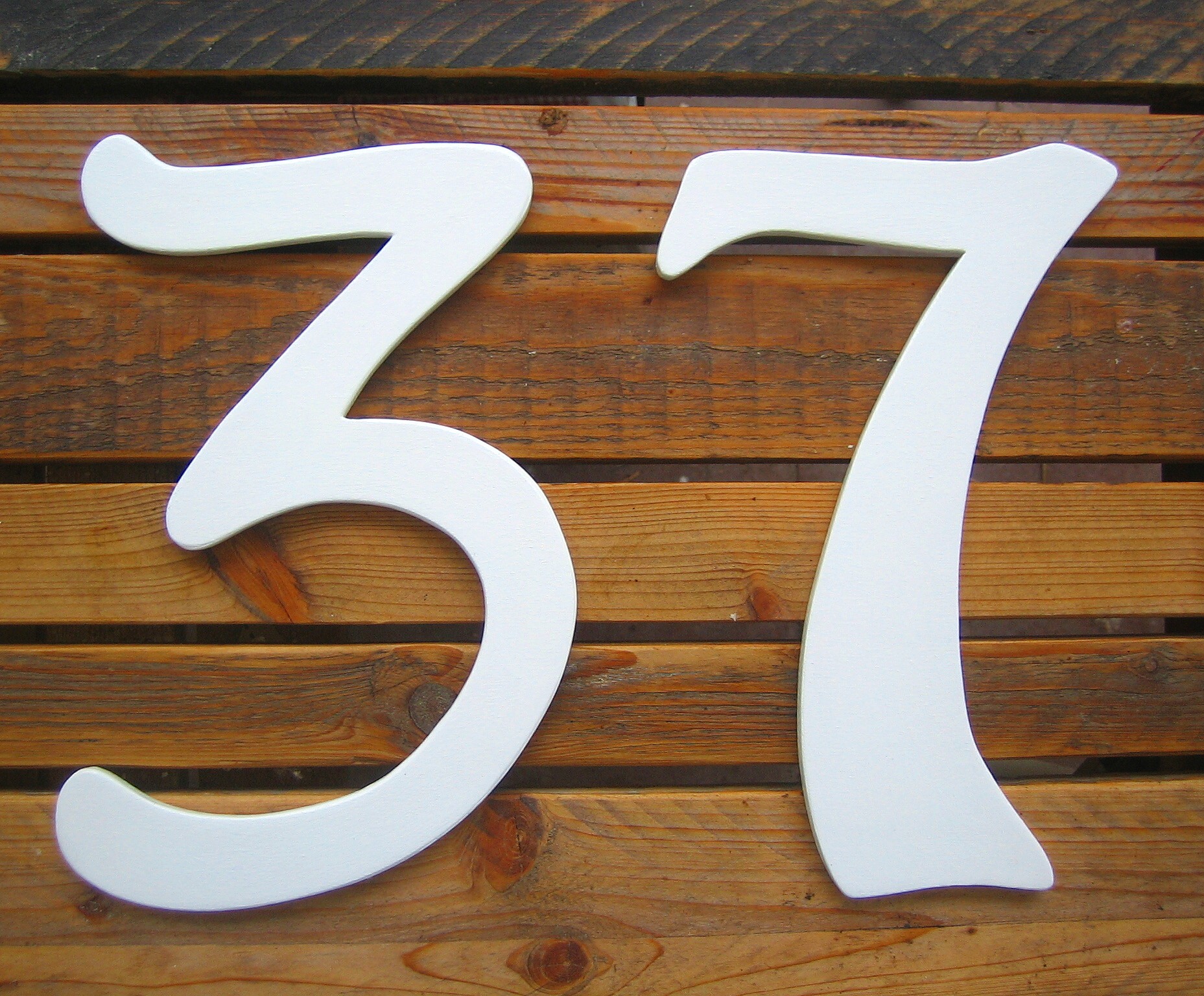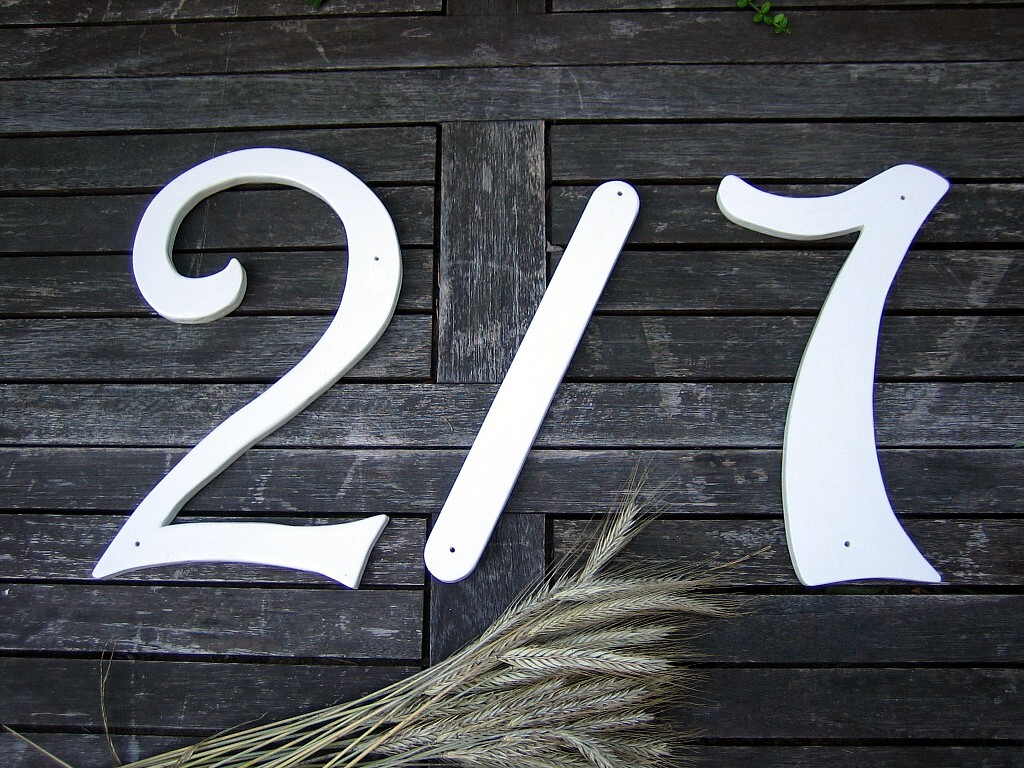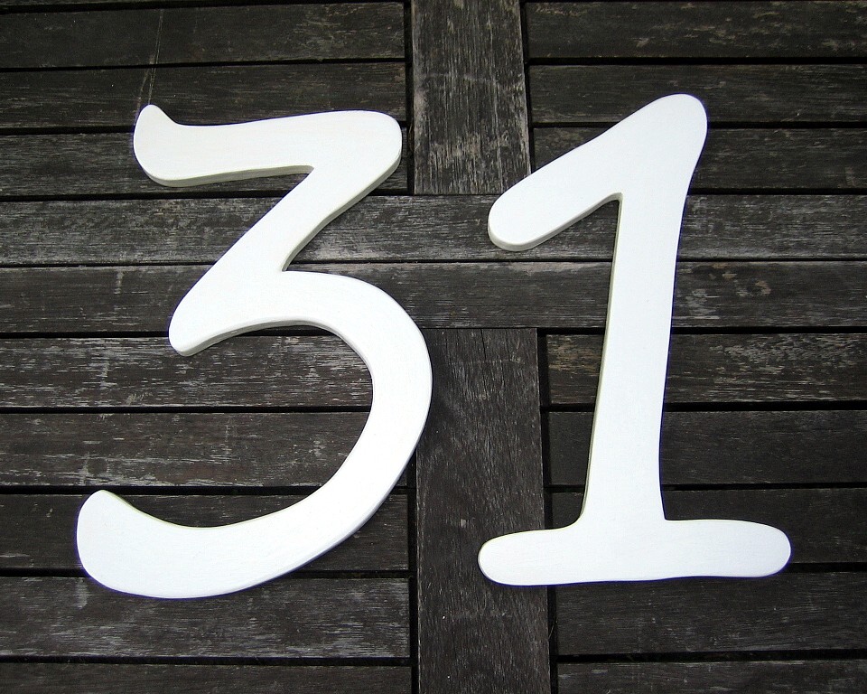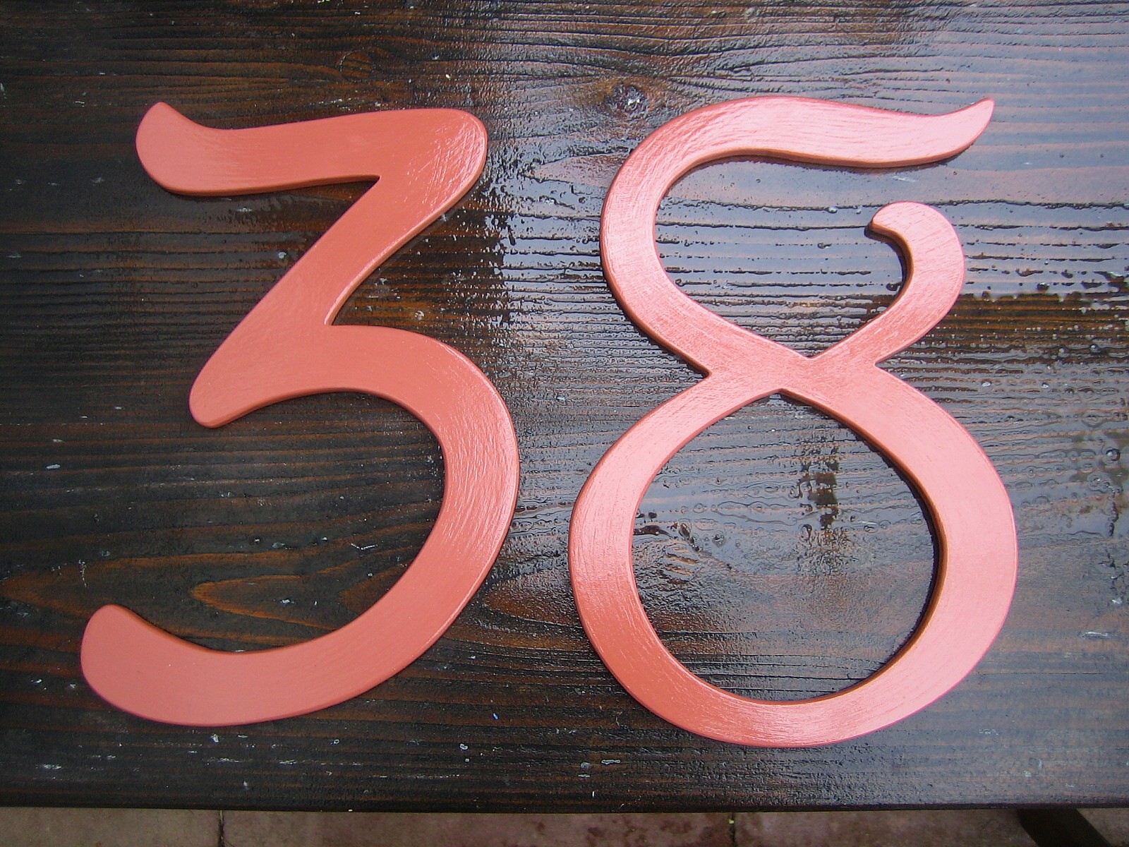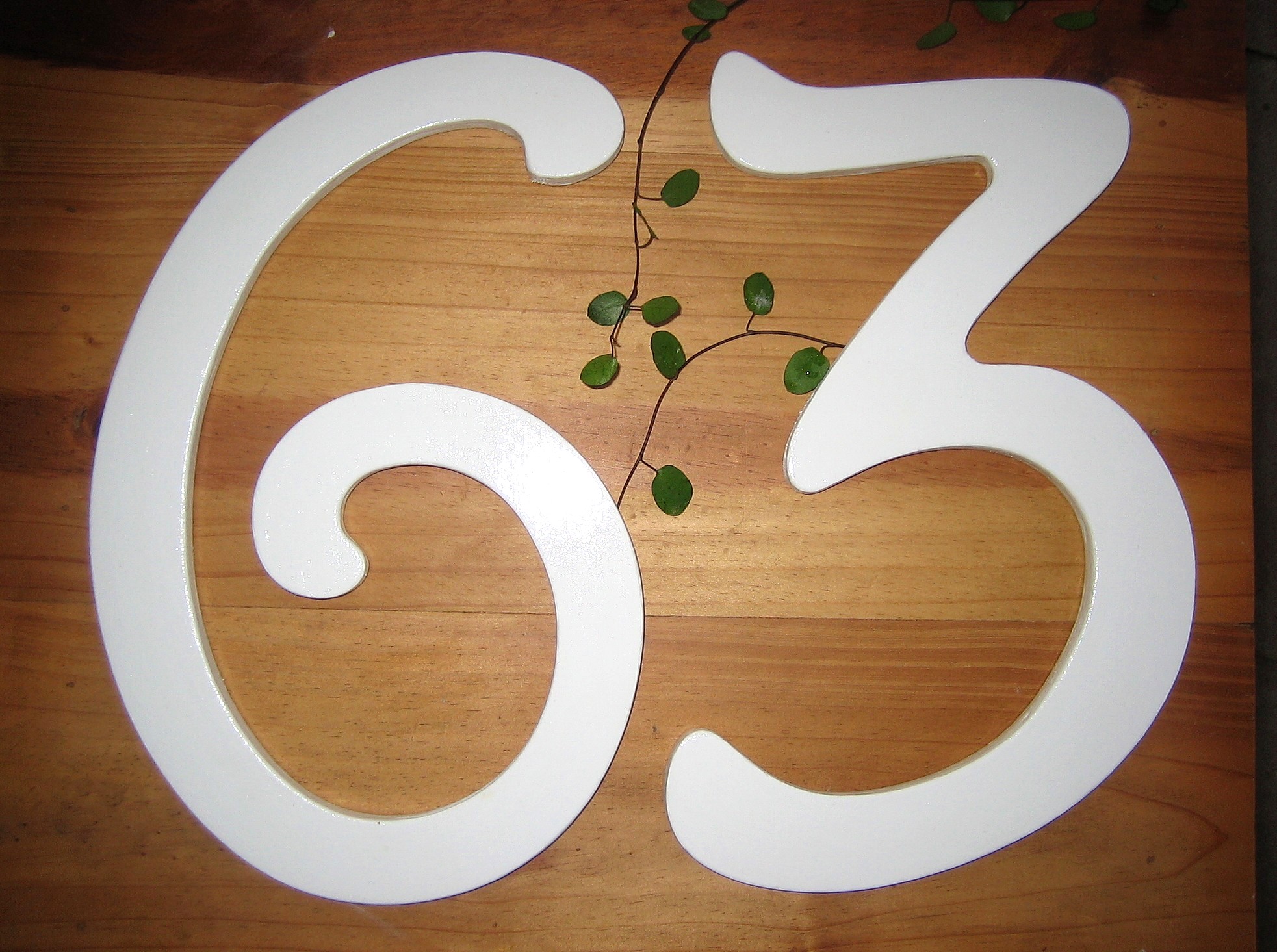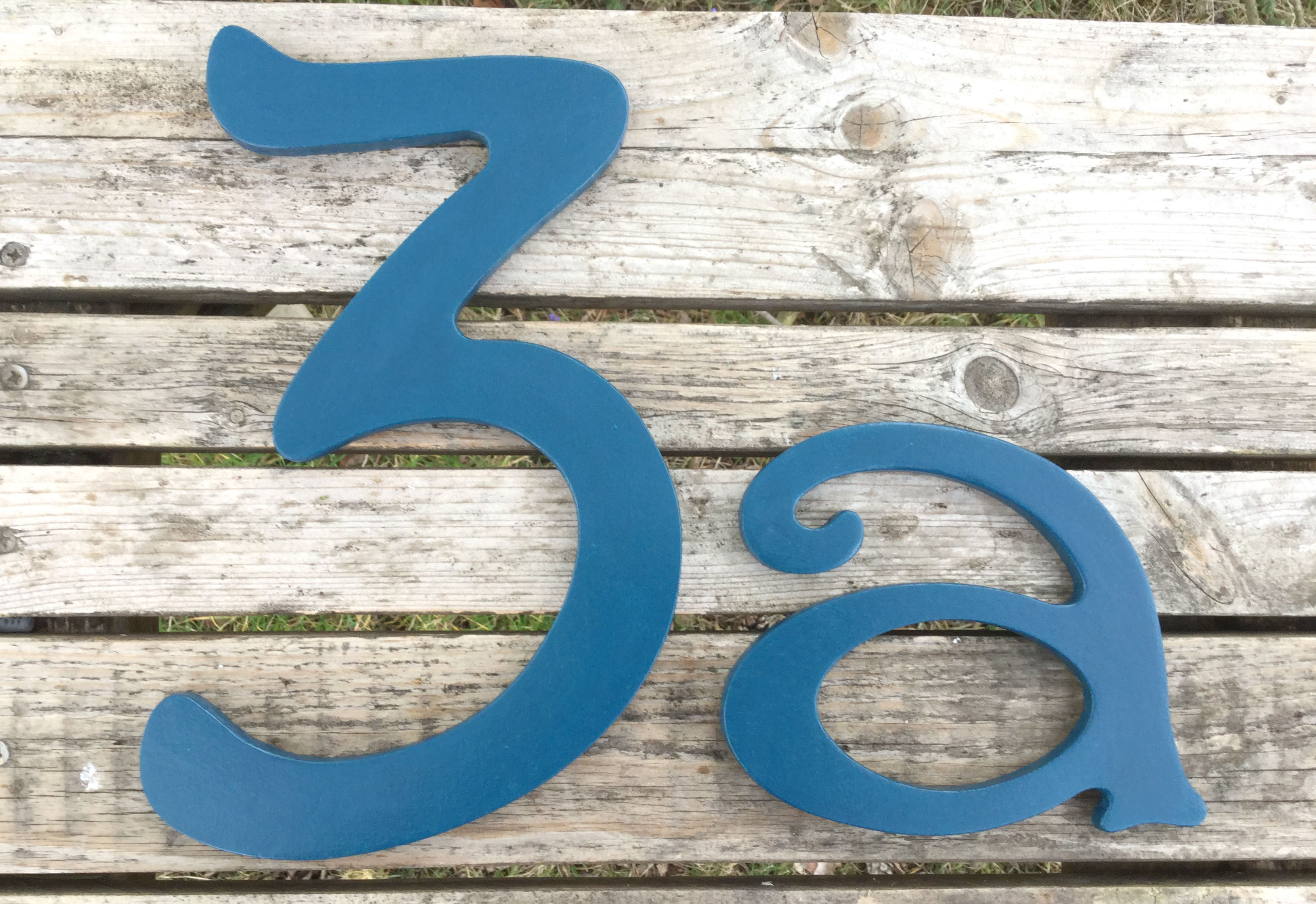 Diese “unübersehbare große” und sehr wirkungsvolle Hausnummer aus Holz ~ gesägte Zahlen ~ ist bestechend in ihrer Größe, Form und Farbe.