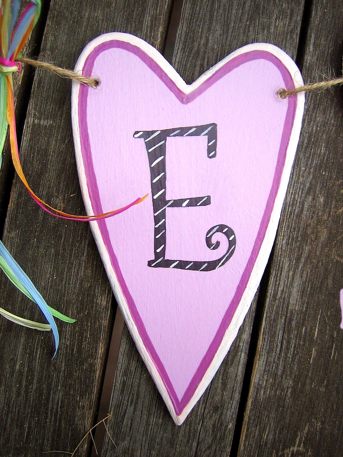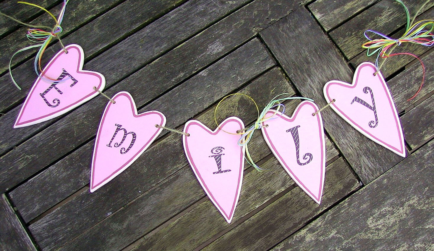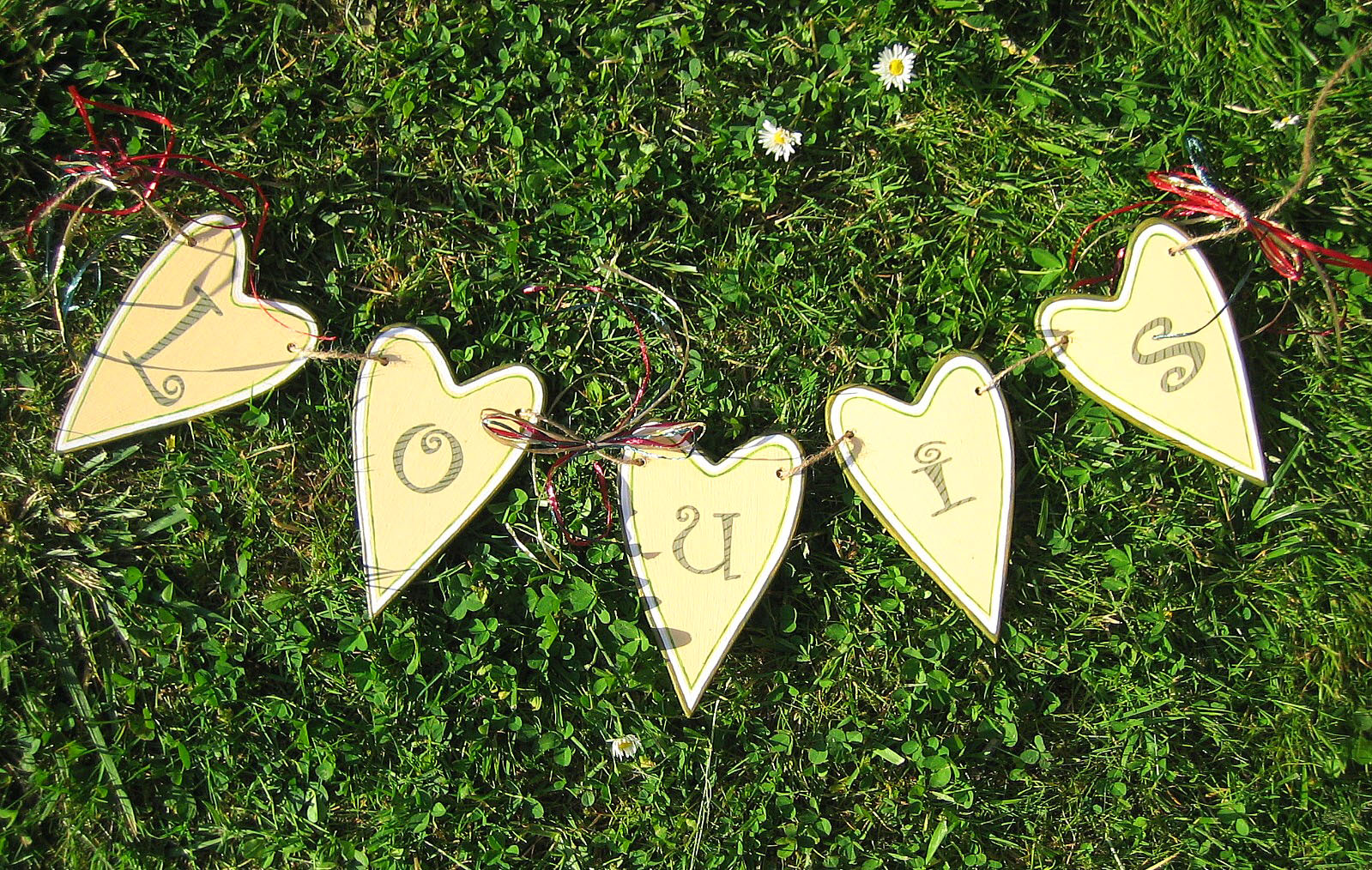 Filigran bemalte und verzierte Herzen mit den Buchstaben eines Kindernamens sind zu einer süßen Wimpelkette zusammengefügt: Ein hübsches Accessoires für die Kinderzimmertüre, über dem Bettchen oder am Fenster.
